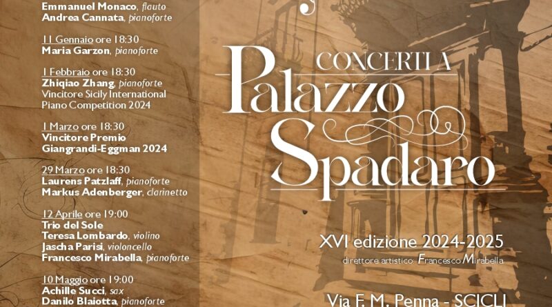 Pronta la XVI edizione dei Concerti a Palazzo Spadaro. Un calendario di 12 appuntamenti che ci accompagnerà dal sabato 9 novembre fino all’inizio di Luglio. Avremo come sempre artisti eccezionali, chi giovane talento, chi navigato concertista, provenienti da Italia, Polonia, Russia, Cina, Spagna, Germania, Austria, Stati Uniti, Svizzera, Canada. Il cartellone molto vario, nelle formazioni e nei repertori che presenteranno, incontrerà, ne siamo certi, il gusto di ciascuno di voi.