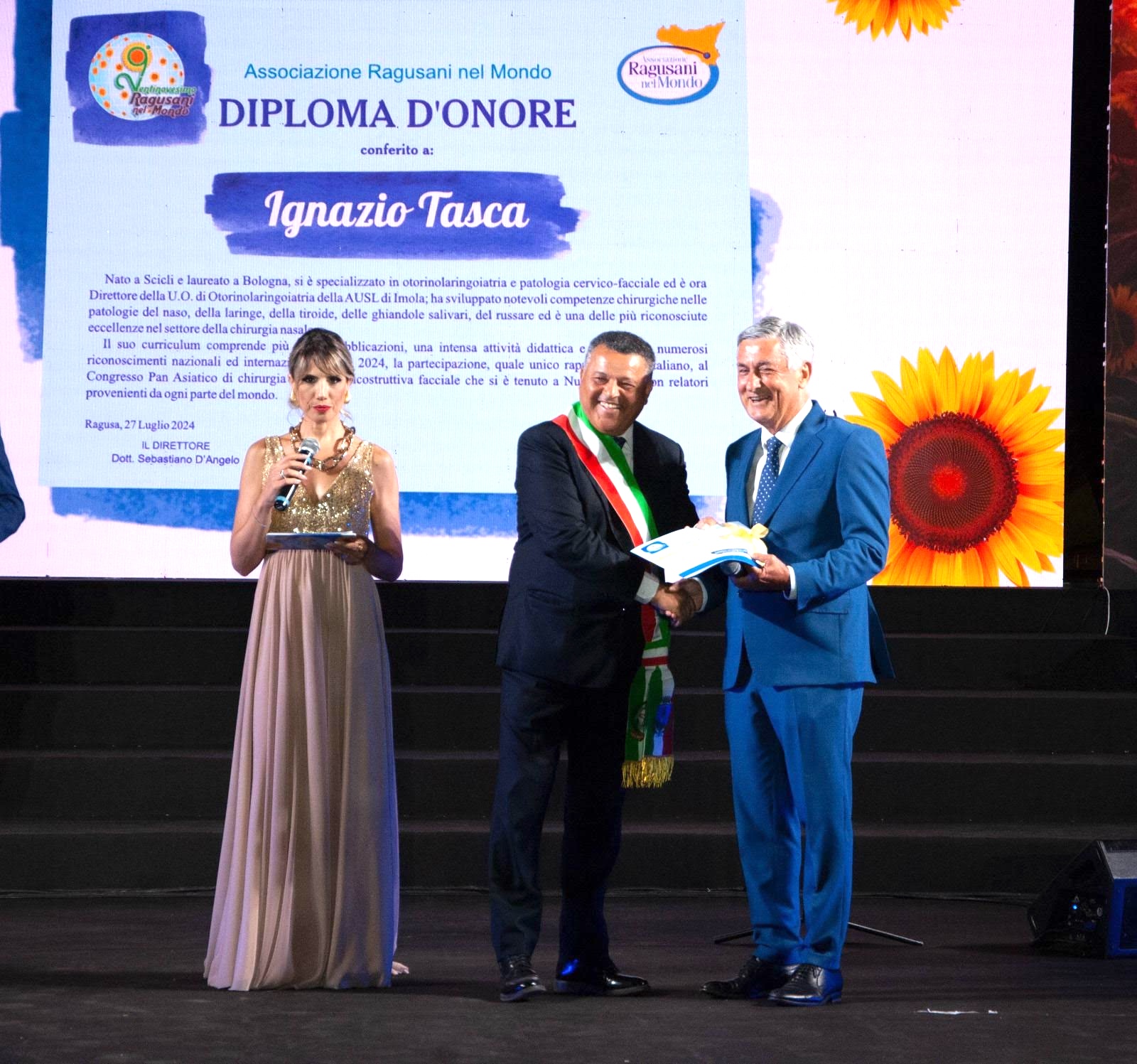 Durante la serata il sindaco di Scicli Mario Marino ha consegnato il premio al dottor Ignazio Tasca, medico chirurgo di Scicli, luminare di fama internazionale in otorinolaringoiatria, in forza alla direzione dell’Unità Operativa Complessa di Otorinolaringoiatria dell’Ausl di Imola.