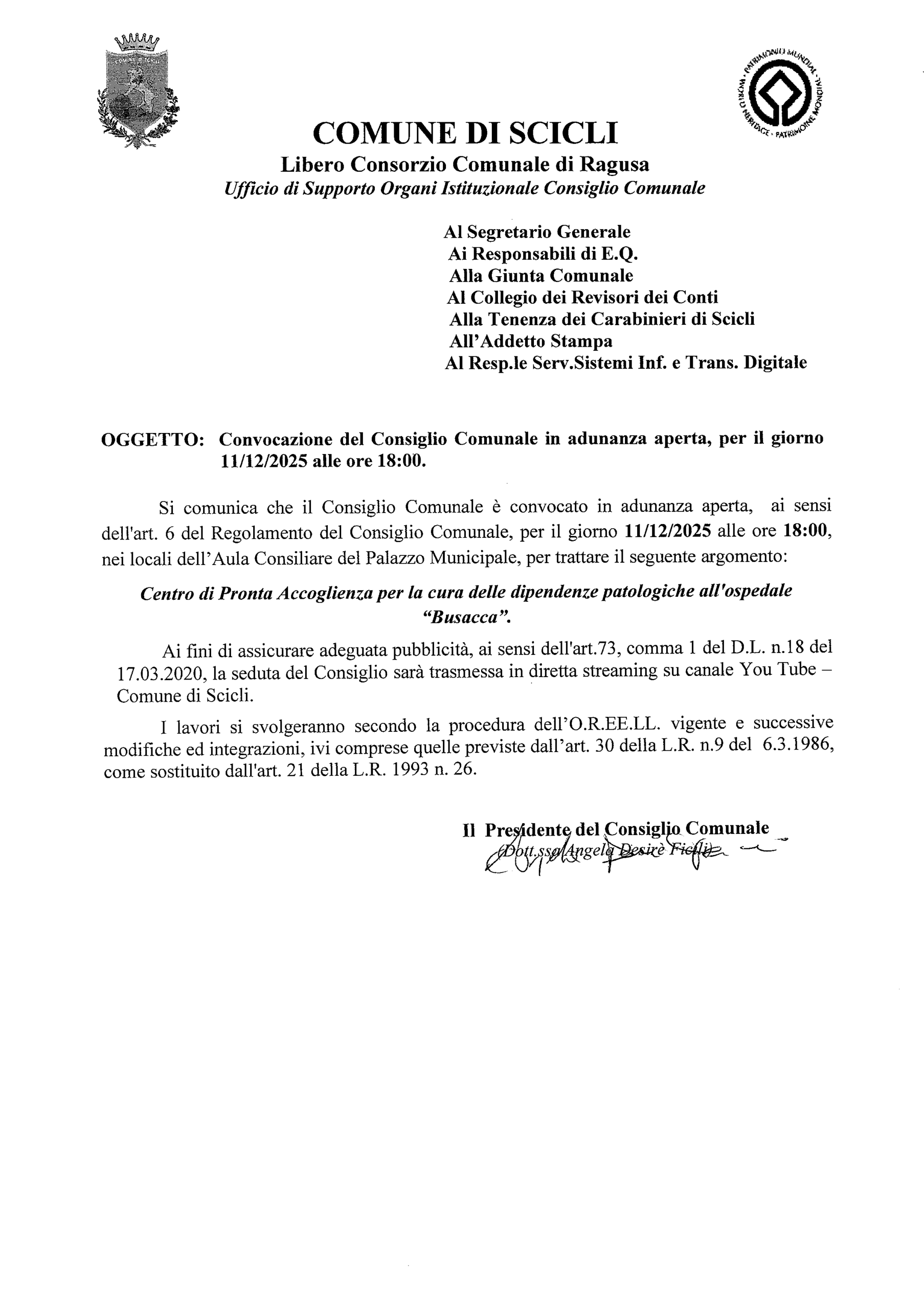 EvidenzaPolitica Consiglio comunale aperto per giorno 11 dicembre: OdG- Centro Pronta Accoglienza all’Ospedale Busacca. 5 Dicembre 2025 Redazione