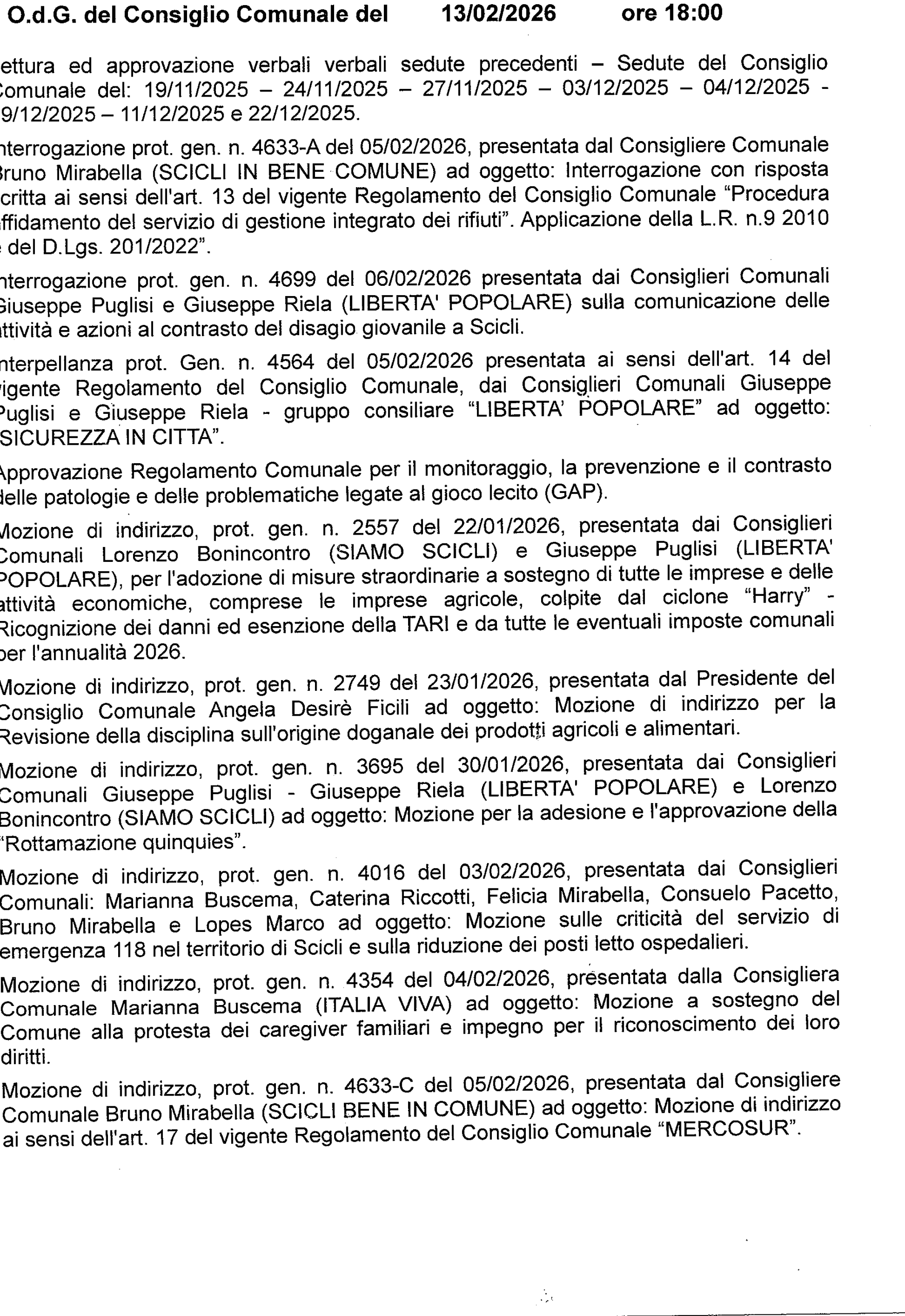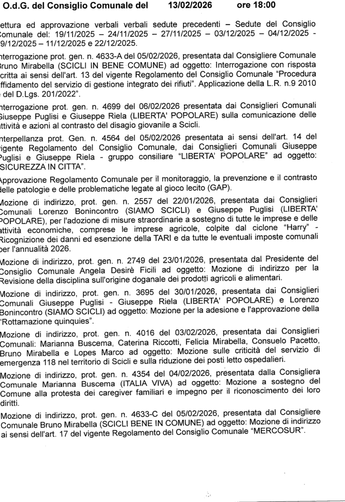 Consiglio comunale giorno 13 febbraio