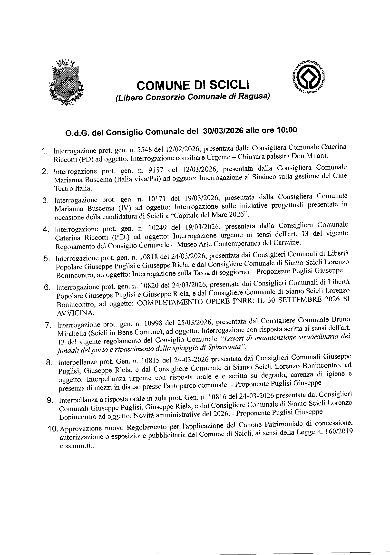 Consiglio comunale giorno 30 marzo: Interrogazioni e Interpellanze