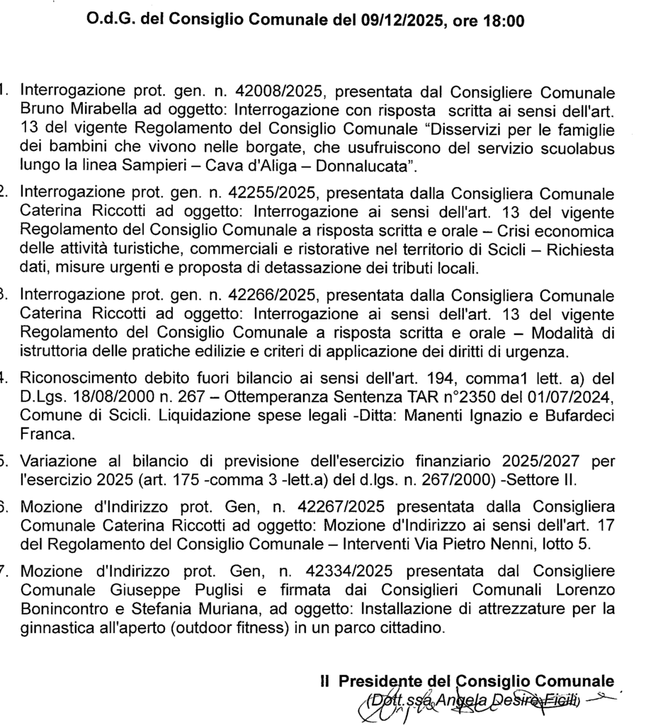 Consiglio comunale giorno 9 dicembre