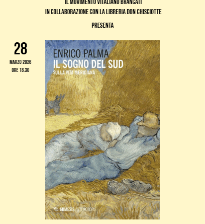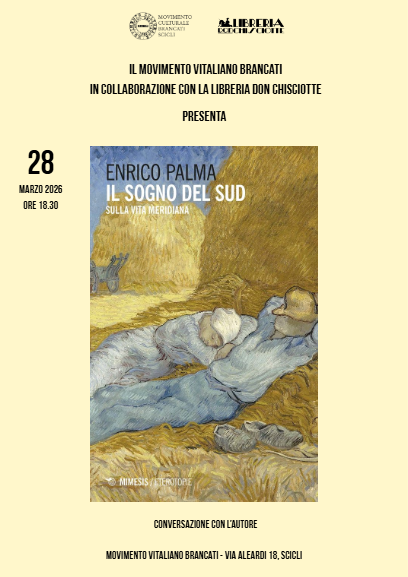 Nell’ambito delle “Conversazioni a Scicli 2026 al “Brancati” di via Aleardi a Scicli presentazione di un bel libro, breve ma intenso: “Il Sogno del Sud” di Enrico Palma. Verrà presentato il sabato 28 marzo alle 18,30 presso la sede del Movimento. Una parte del saggio in questione è dedicata all’opera di Piero Guccione e alla sua scelta di ritornare a vivere e lavorare in Sicilia dopo un lungo periodo vissuto a Roma. Si tratta di un’opera importante, che tocca un po’ tutti coloro che hanno scelto di vivere e lavorare al Sud. “Questo libro cerca di concepire un altro punto di vista, attraverso l’accostamento ad alcune esperienze filosofiche e artistiche di notevole coraggio e orgoglio teoretici (Van Gogh, Heidegger, Guccione), nel tentativo di concettualizzare una metafisica della vita, appunto di una vita meridiana, da compiersi idealmente a Sud come luogo della verità, nel quale la luce, la terra, il cielo e il mare si mostrano per come sono realmente”.