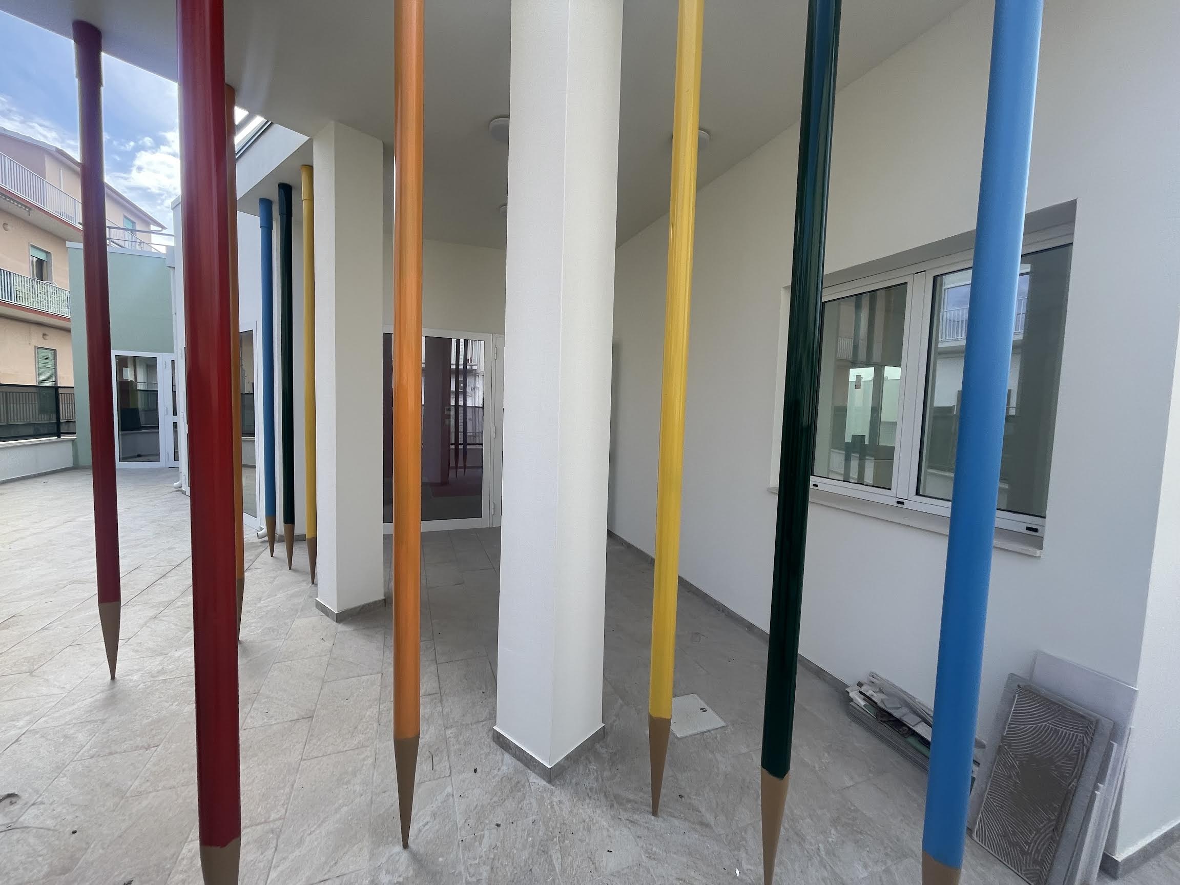 Due curiosità: per rendere ludico e accogliente agli occhi dei bambini il luogo della loro formazione è stato scelto come elemento architettonico riconoscibile e identitario una teoria di matite colorate come pilastri all’ingresso del nido, mentre all’interno vi è una parete pantone con tutti i colori, che nella parte inferiore ospita una porzione nera con la cosiddetta “pittura lavagna”, su cui i piccoli potranno sbizzarrirsi a colorare.