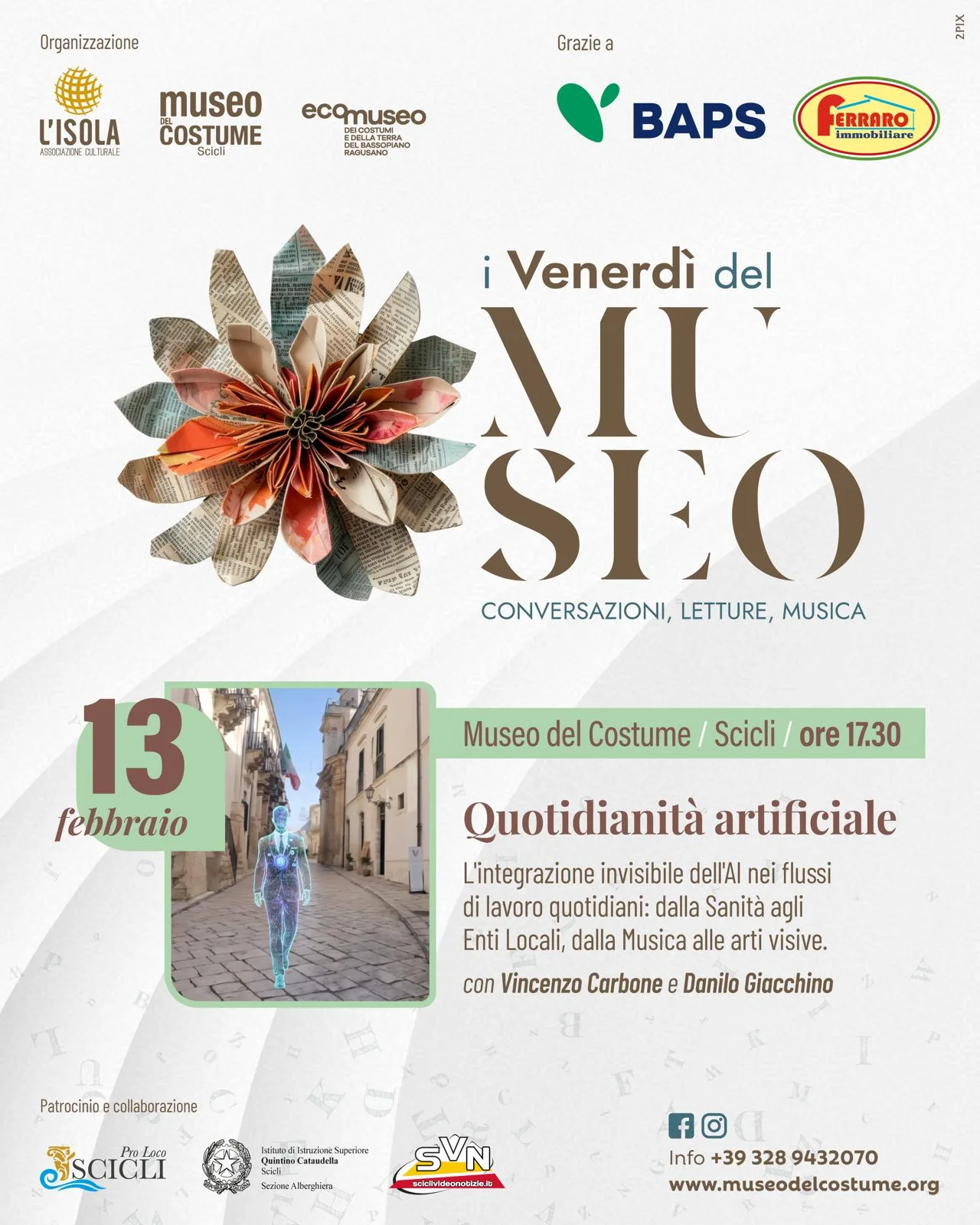 Iniziano nel pomeriggio “I Venerdì del Museo”, in via Mormina Penna a Scicli. L’appuntamento è alle ore 17,30 nei locali del Museo del Costume. L’incontro è sul tema “Quotidianità artificiale”. L’integrazione invisibile dell’AI nei flussi di lavoro quotidiani: dalla Sanità agli Enti Locali, dalla Musica alle Arti visive. Ne parleranno Vincenzo Carbone e Danilo Giacchino. Ingresso libero.